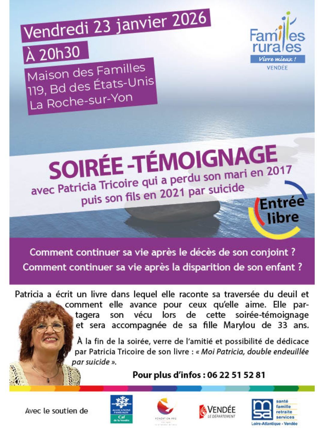 À noter : à la fin de la soirée, verre de l’amitié et possibilité de dédicace par Patricia Tricoire de son livre : « Moi Patricia, double endeuillée par suicide ».